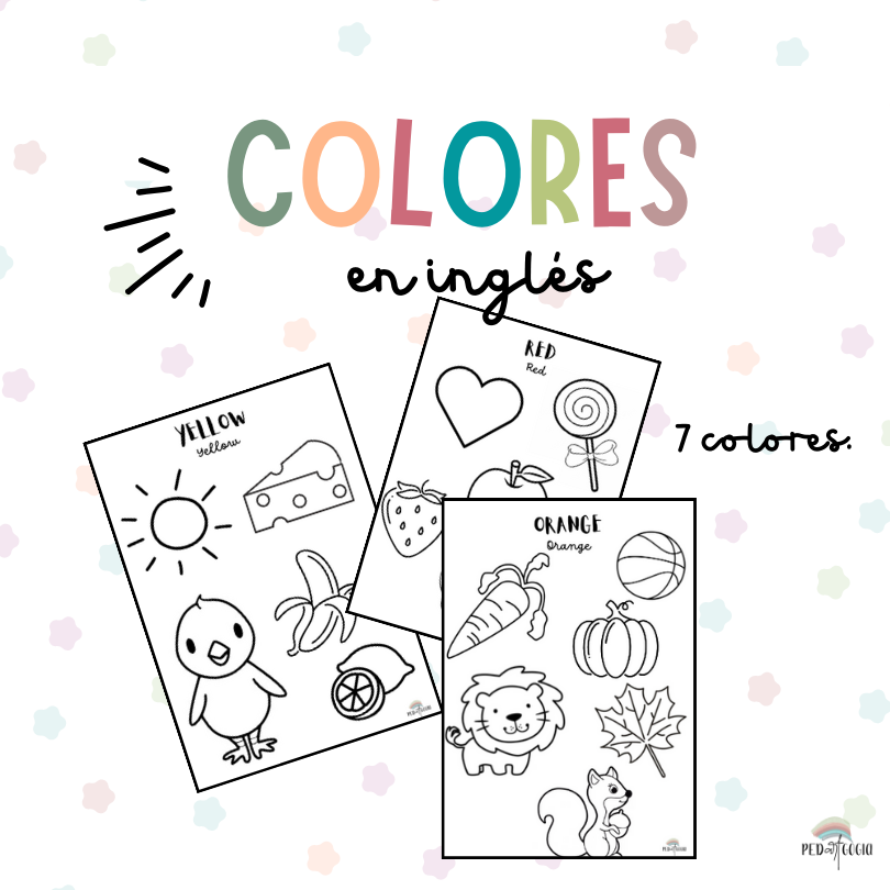 El PDF consta de 7 páginas con 7 colores: Yellow (amarillo), rojo (red), naranja (orange), verde (green), azul (blue), rosa (pink) y marrón (brown).